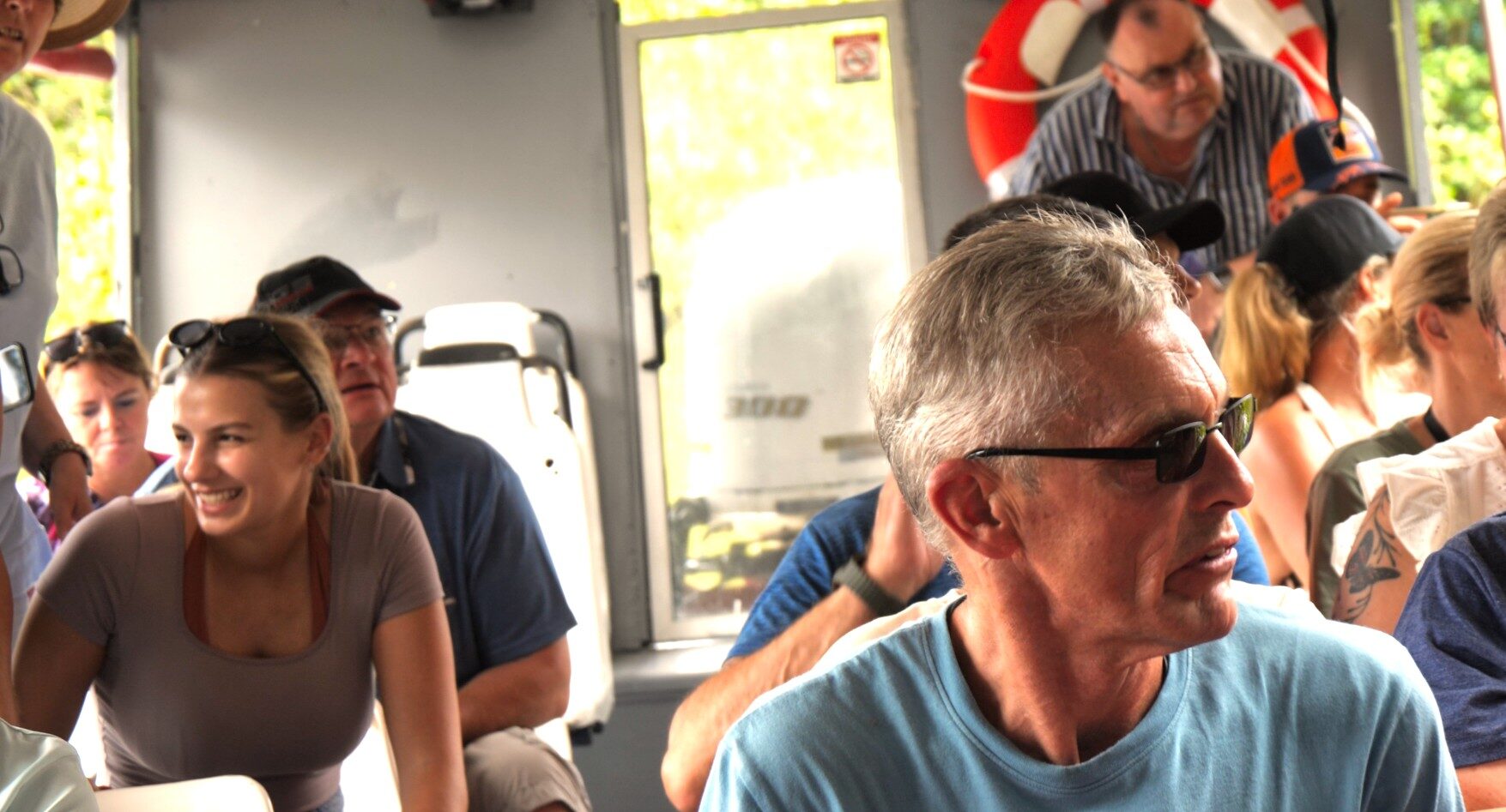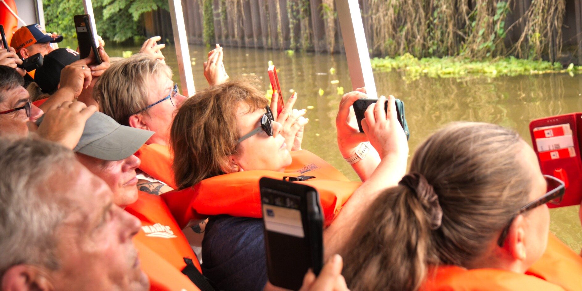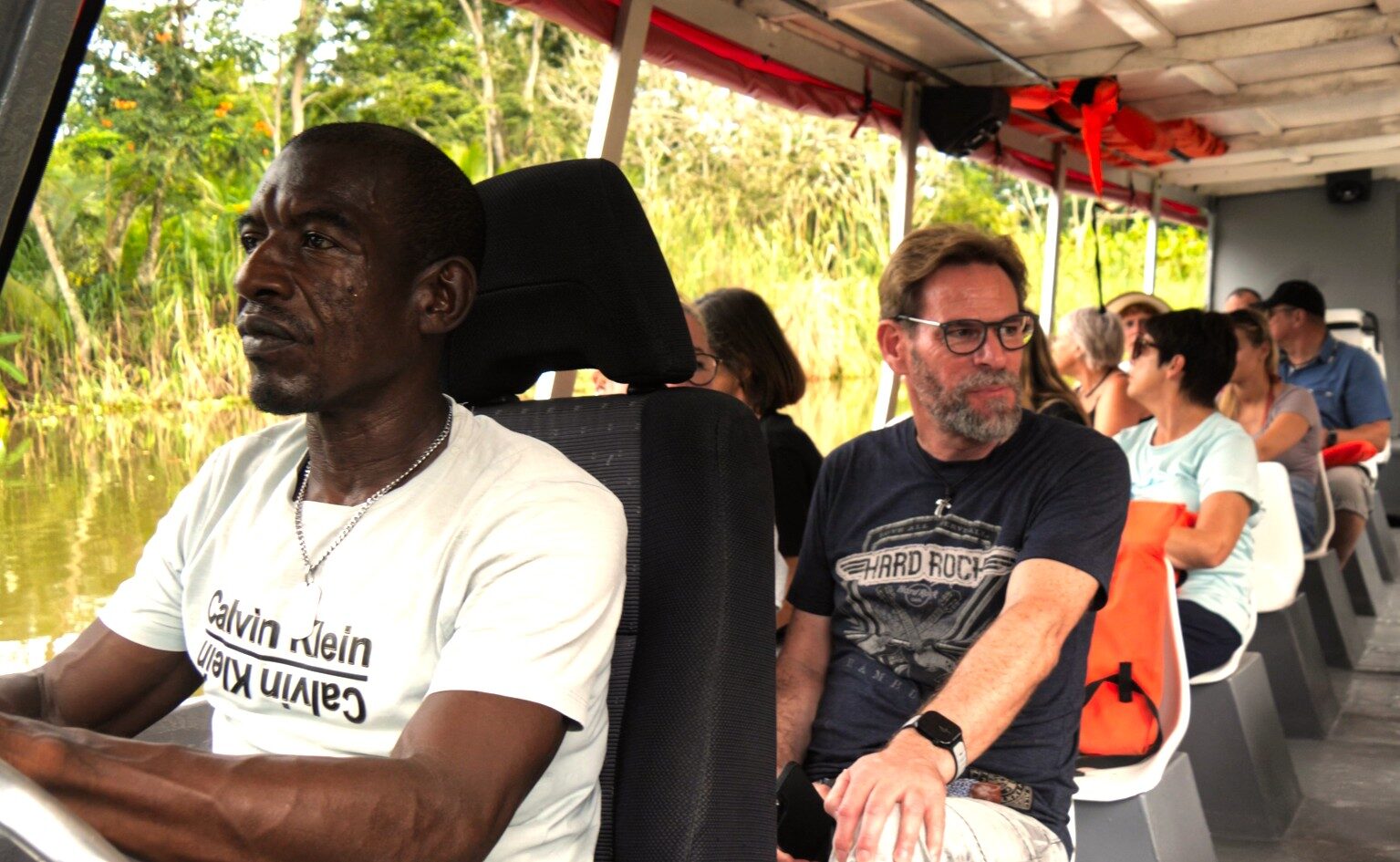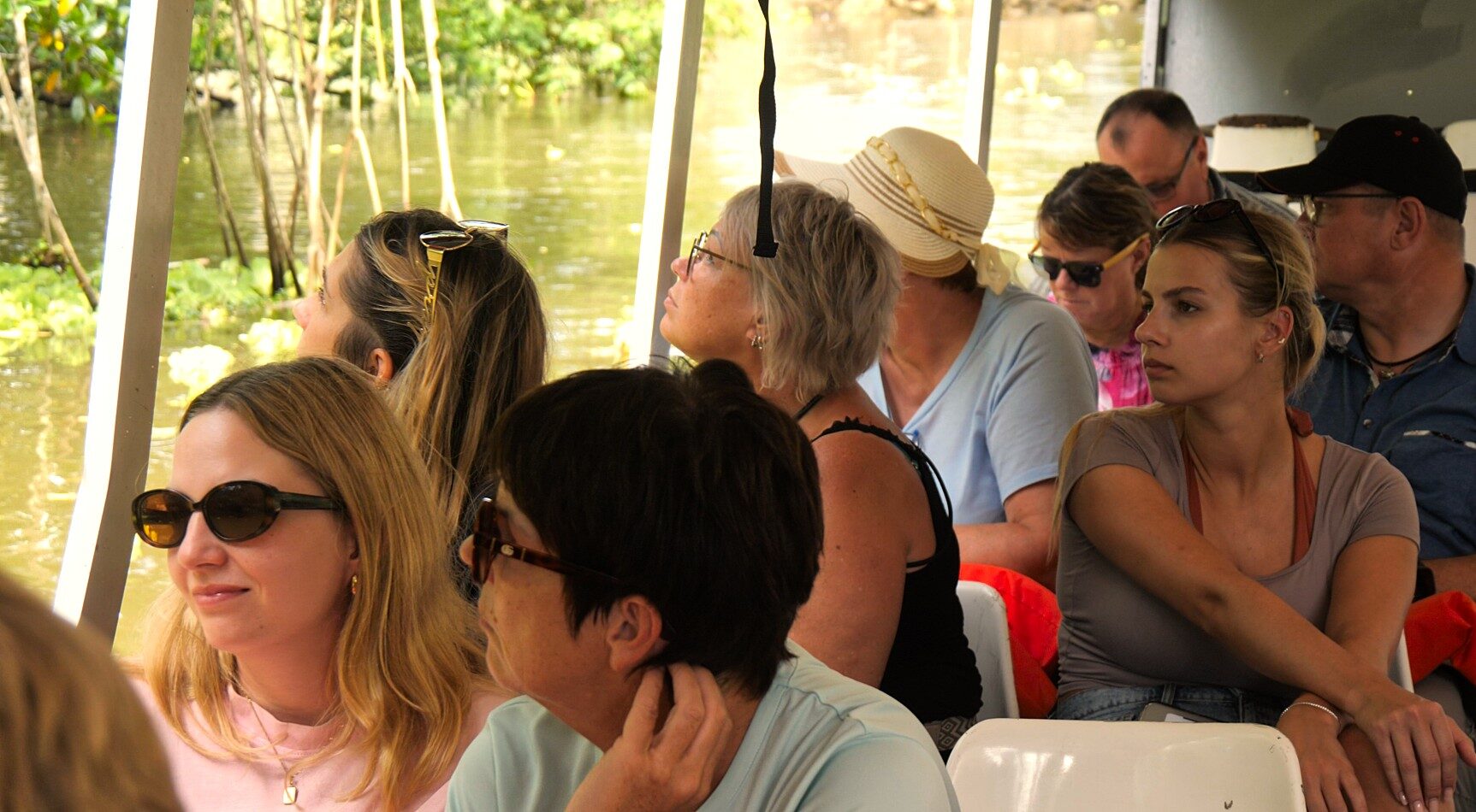 Wir sind mein einem großen, überdachten Boot unterwegs